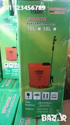 Нов дизайн с високо качество, комфортна, икономична и ефективна при употреба електрическа гръбна пръскачка с нова по-изгодна цена. Ръкохватка без клапан и помпа без допълнителен пресостат - направена максимално опростена за безпроблемна работа. Пръскачката използва необслужваем оловен акумулатор с гел и миниатюрен електродвигател, задвижващ помпата, която създава налягането, както и индикация за моментен заряд. Пулверизиращият ефект е 3-4 пъти по-ефективен в сравнение с обикновена ръчна пръскачка. Подходяща за пръскане на зеленчуци, овощни градини, лозя, за обеззаразяване на складове и др. Регулиране на налягането посредством потенциометър и бутон за работа на пълна мощност.