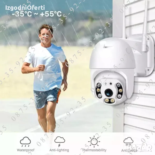 Smart WiFi камерата има проследяване на движението, детекция на хора и аналитични функци, като зониране и задаване на периметър. Устройството има вграден цифров микрофон и говорител за двупосочна аудио връзка и позволява завъртране по хоризонтала на 355° и по вертикала на 110° от разстояние посредством интернет от телефон, таблет или компютър. Разполага с 4 броя IR LED ARRAY + 4 броя WHITE LED осветителя осигуряващи ЦВЕТНО нощно наблюдение до 30 метра. Камерата се настройва изключително лесно с помощта на мобилното приложение, инсталирано на Вашия смартфон. Приложениeтo e безплатно и е налично за iPhone и Andorid. Освен видеоизображения в реално време, Вие получавате и звуков сигнал от мястото, където е инсталирана камерата и във всеки един момент сте наясно какво се случва в охранявания обект. Камерата има вграден говорител и може да кажете на куриера, да дойде утре или на нарушителят, че полицията е на път.