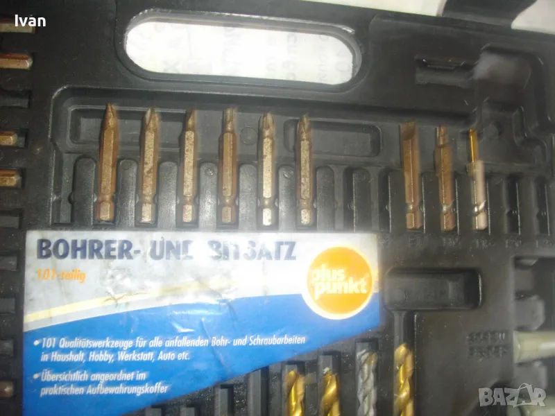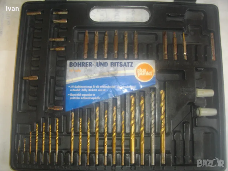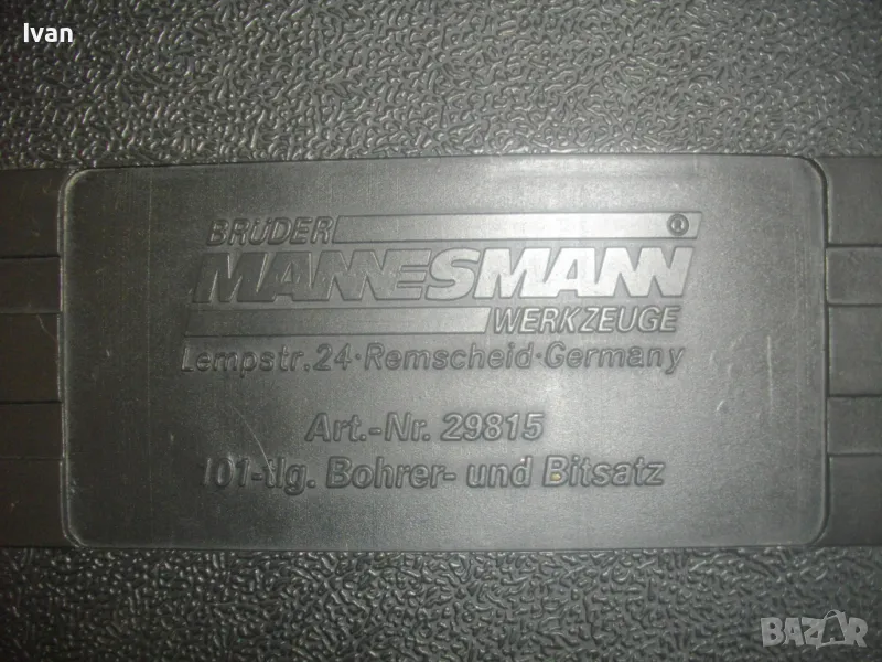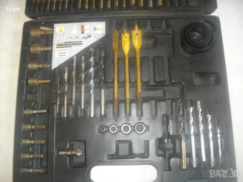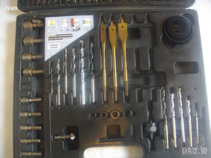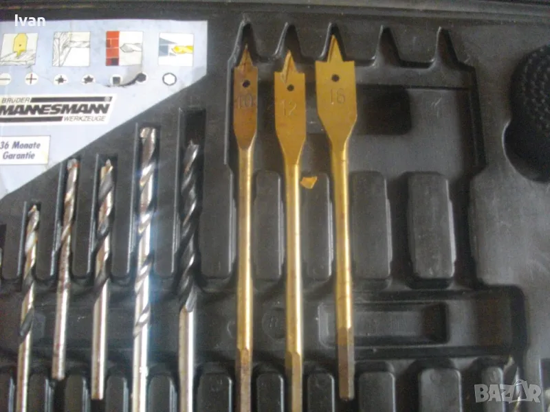 ОПИСАНИЕ на инструменти гедория в черен пластмасов куфар - цена 139 лв. Нов комплект, немски оригинален на Манесмън. Марка и модел - Bruder Mannesmann Werkzeuge 101 tlg. BOHLER und Bitsalz - Germany. Комплектът е непълен /общо трябва да са 101 части. Налиични са 73 части компоненти и инструменти. Размери на куфара - 345 х 295 х 50 мм. Включва битове, накрайници, адаптери, свредла големи и малки, 4 бр. масивни твърди борфрези/боркорони за дърво/метал с адаптери, 3 бр. дърводелски свредла размери 10мм - 12 мм - 16 мм, 5 бр. държачи ии водачи за боркороните, цилиндрична фреза, 9 бр. адаптерни торса вложки различни размери. Куфара е с вложка вградена за местата на компонентите. Цена 139 лв.