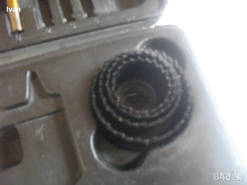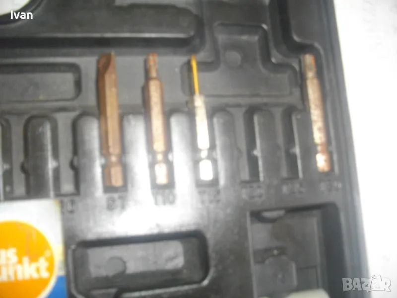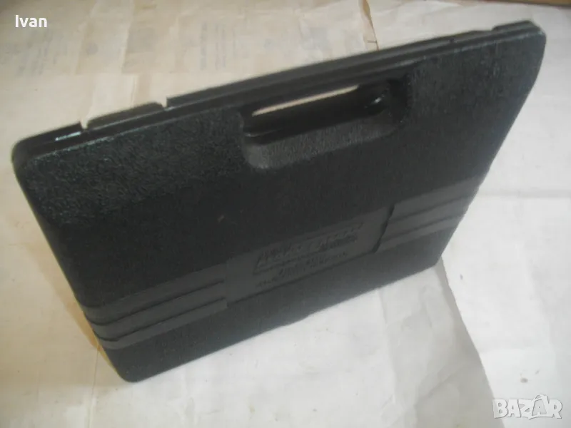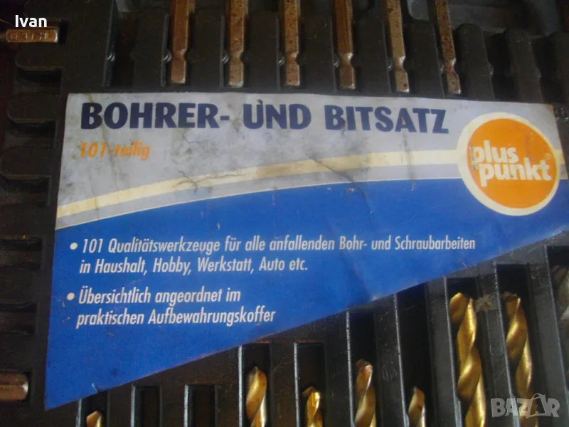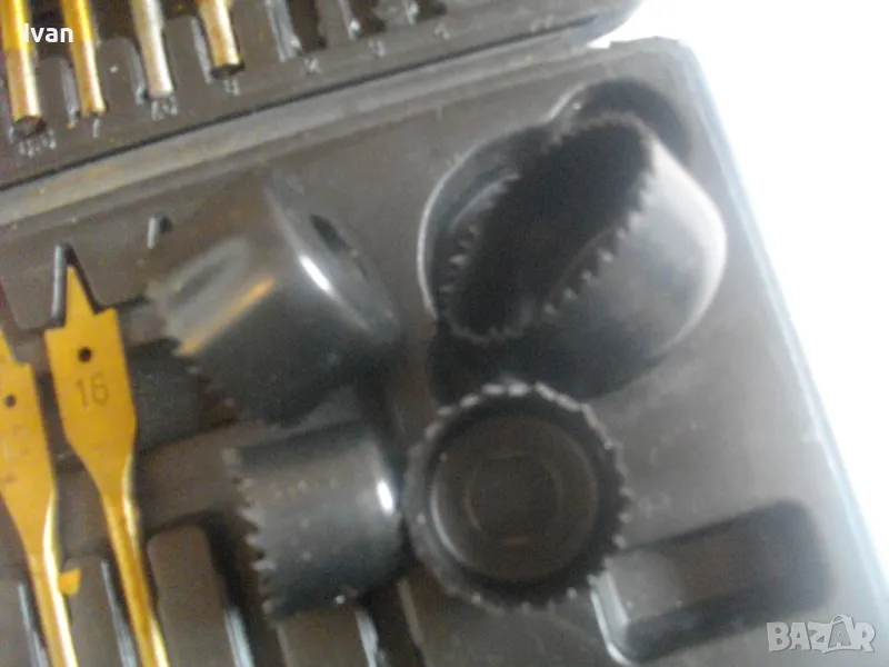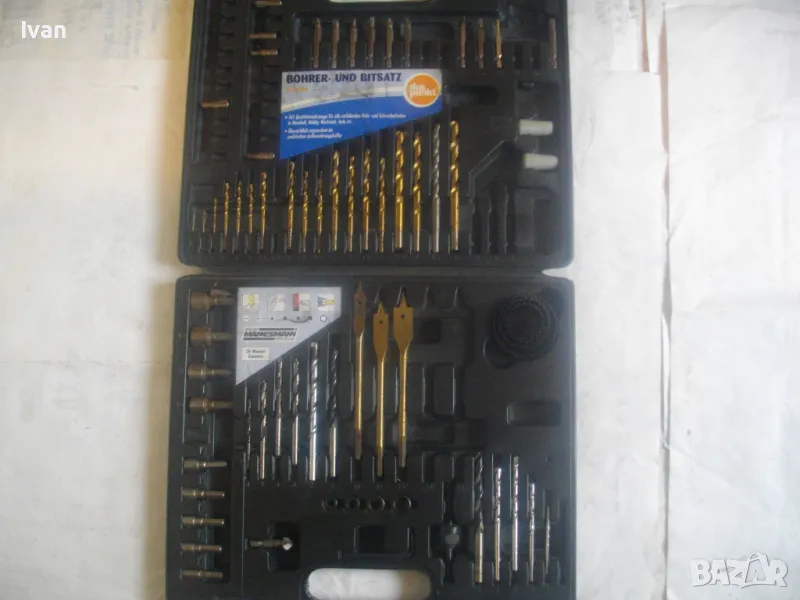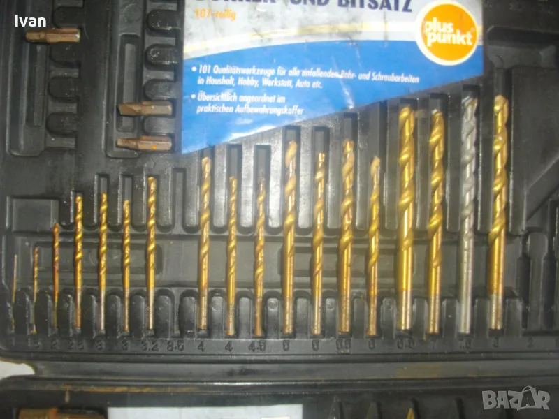 ОПИСАНИЕ на инструменти гедория в черен пластмасов куфар - цена 139 лв. Нов комплект, немски оригинален на Манесмън. Марка и модел - Bruder Mannesmann Werkzeuge 101 tlg. BOHLER und Bitsalz - Germany. Комплектът е непълен /общо трябва да са 101 части. Налиични са 73 части компоненти и инструменти. Размери на куфара - 345 х 295 х 50 мм. Включва битове, накрайници, адаптери, свредла големи и малки, 4 бр. масивни твърди борфрези/боркорони за дърво/метал с адаптери, 3 бр. дърводелски свредла размери 10мм - 12 мм - 16 мм, 5 бр. държачи ии водачи за боркороните, цилиндрична фреза, 9 бр. адаптерни торса вложки различни размери. Куфара е с вложка вградена за местата на компонентите. Цена 139 лв.