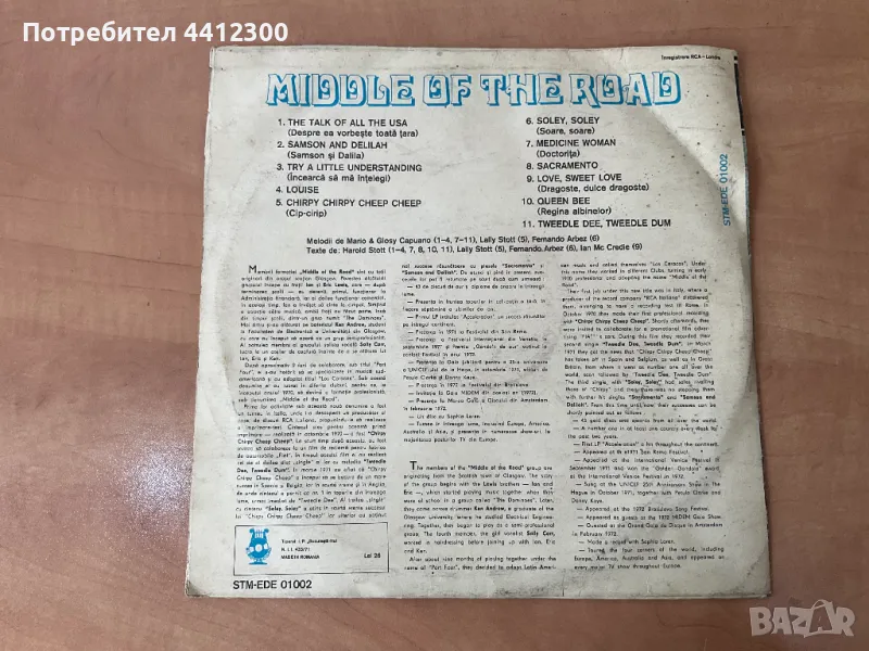 Здравейте, грамофонна плоча 12 инча Middle of the road.Не нося отговорност за състоянието на плочите, не почиствам плочи. Вие поемате риск, когато закупувате от мен, ако имате въпроси, може да ми звънете на посочения номер или да ми напишете съобщение. Отговарям след 18 часа, цените не се коментират, ако не се вземат повече от 10 плочи. Благодаря, че прегледахте обявата ми. Лек и спокоен ден!