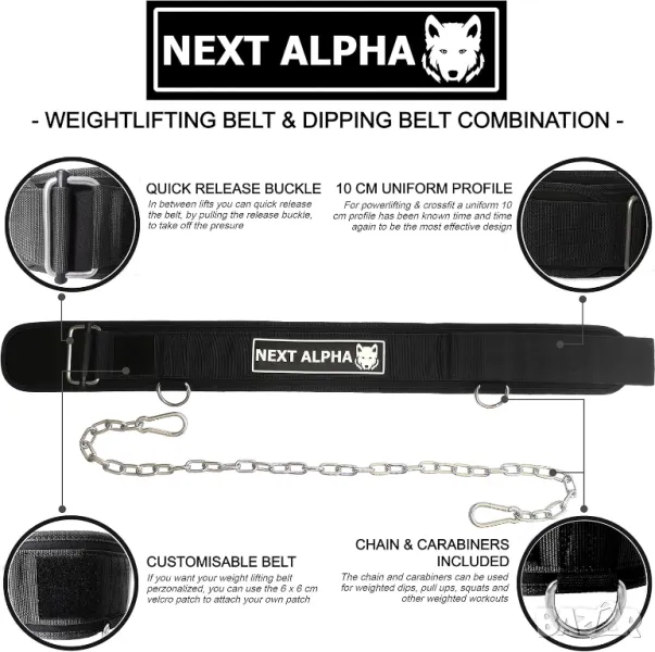 Включва бонус верижка и кука за карабинер: към колана е включена бонус верижка с карабинери. Веригата и карабинерът могат да се използват за набирания с тежест, набирания, клекове и други тренировки с тежест. Коланът с верига е тестван при тренировки с натоварване от 100 кг.