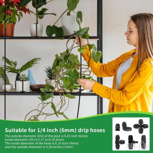 Подходящ за напоителен маркуч от 1/4 инча до 6 мм: Връзка от 6 мм към 1/4 инча. Външният диаметър на маркуча (OD) е 6.35мм, а вътрешният диаметър (ID) е 4.32мм.