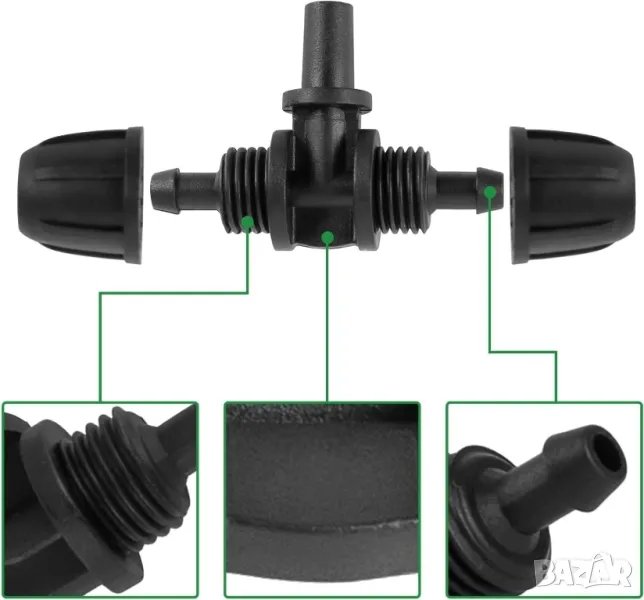 Продуктите включват: 40 броя 6 мм към 1/4 инча маркуч троен конектор със заключване . Той е изработен от високоякостна пластмаса, не се чупи и не се деформира лесно. Той е здрав, водоустойчив и издръжлив. Работното налягане е до 45 PSI.