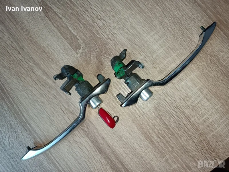 Два броя външни дръжки за Алфа 156 (932).С работещи 2 бр. Еднакви патрони в дръжките. С 1бр. червен ключ, нарязан да отваря и движи двата еднакви патрона. Влявата дръжка ключът се движи вляво и вдясно. В дясната, пасажерската дръжка, ключът се движи само в едната посока.