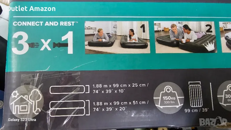 менюsearchfavorite_border0.0shopping_cartsearchcloseКатегорииkeyboard_arrow_rightВдъхновете сеkeyboard_arrow_rightТърговеkeyboard_arrow_leftНазад към Надуваеми дюшециBestway Надуваемо въздушно легло 3-в-1 черно и сиво 188x99x25 смfavorite_border6/8keyboard_arrow_leftНазадkeyboard_arrow_rightНапредМарка: Bestway163.99 лвВкл. ДДСcart_outlineИскам гоcheckmarkНаличенcheckmarkБезплатна доставкаcheckmarkВреме за доставка: 4-6 работни дниinfoПомощОписаниеТова надуваемо въздушно легло 3-в-1 от Bestway ще осигури допълнителна релаксация и комфорт!Устойчив материал: Надуваемото легло е изработено от здрав PVC материал, което го прави устойчиво на повреди.Здрава структура: Конструкцията I-beam осигурява здрава опора, луксозен вид и усещане.Дизайн 3-в-1: Този иновативен въздушен матрак може да се използва по 3 различни начина с помощта на катарамите за лесно свързване. Може да се използва отделно като две двойни легла, свързани заедно за голямо легло тип King или подредени един върху друг за двуслойно двойно легло.Бързо надуване: Можете лесно да го надуете и изпуснете с двупосочен блокиращ клапан за бързо освобождаване.Удобна повърхност: С удобна повърхност за спане, страхотният нощен сън е точно зад ъгъла.СпецификацииЦвят: Черно и сивоМатериал: PVC (поливинилхлорид)Размери: 188 x 99 см (Д x Ш)Височина на леглото (еднослойно): 25 смВисочина на леглото (двуслойно): 51 смКонтурна вертикална I-beam конструкцияДизайн 3-в-1: 2 двойни надуваеми легла, 1 двойно надуваемо легло или двуслойно двойно надуваемо леглоРегулируеми катарами2-пътен блокиращ вентил за бързо освобождаване за бързо и лесно надуване и изпускане на въздухаУдобна флокирана повърхност за спане
