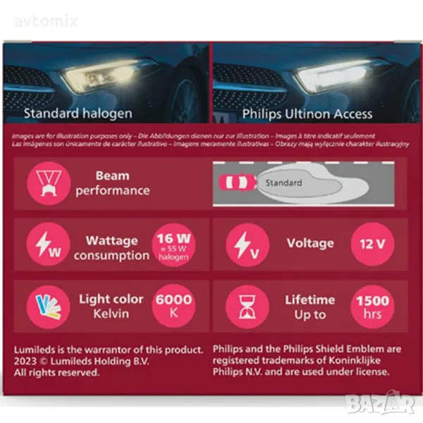 - Осигуряват мощен светлинен поток от студено-бяла светлина (6000К) с над 150% по-ярка от стандартните халогенни крушки;