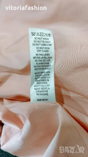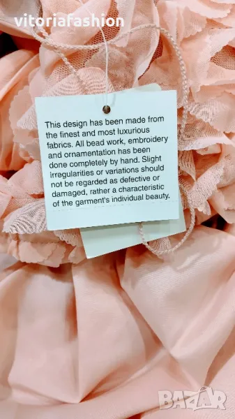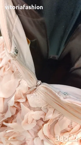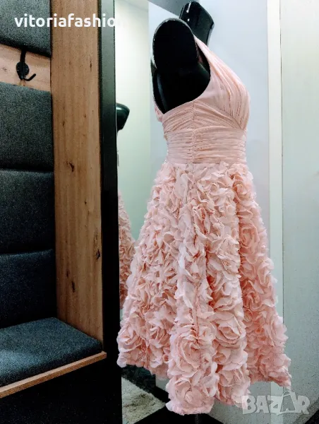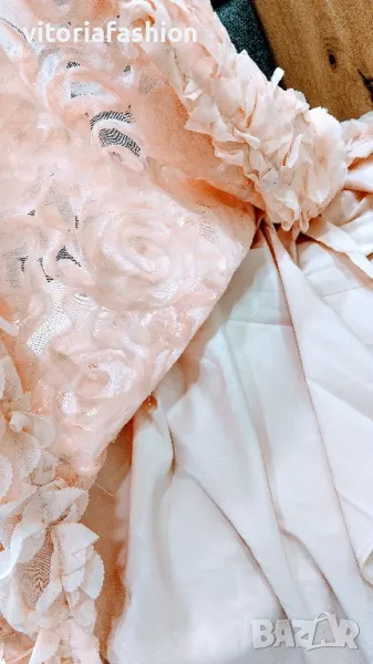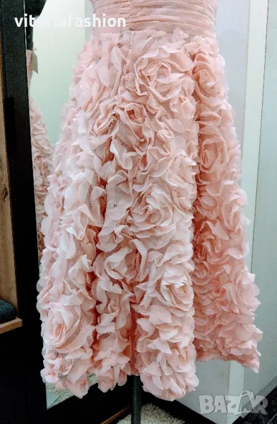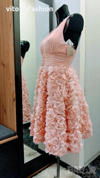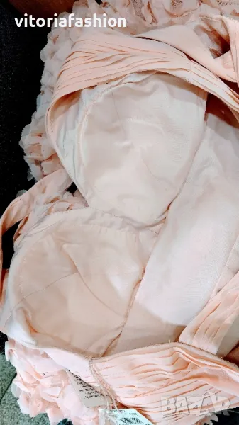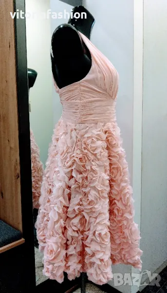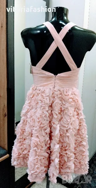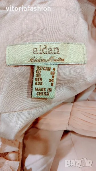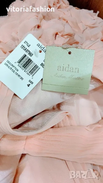 Тази луксозна и изключително красива рокля от Aidan Mattox е идеална за сватба, бал, както и всякакъв друг официален повод. Корсажът и коланът са плисирани, а кръстосаните презрамки правят интересен гръб. Чашките на корсажа са изцяло подплатени. Полата А-силует е покрита с разкошни цветя от тюл, създаващи невероятна текстура както отблизо, така и отдалеч. Полата е подплатена и има заден цип. Цвят: светло розов Размер: S Нова с етикет.