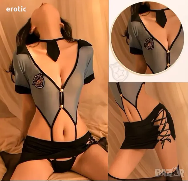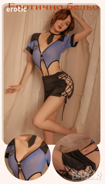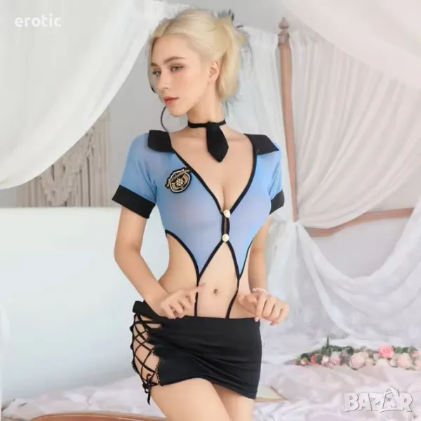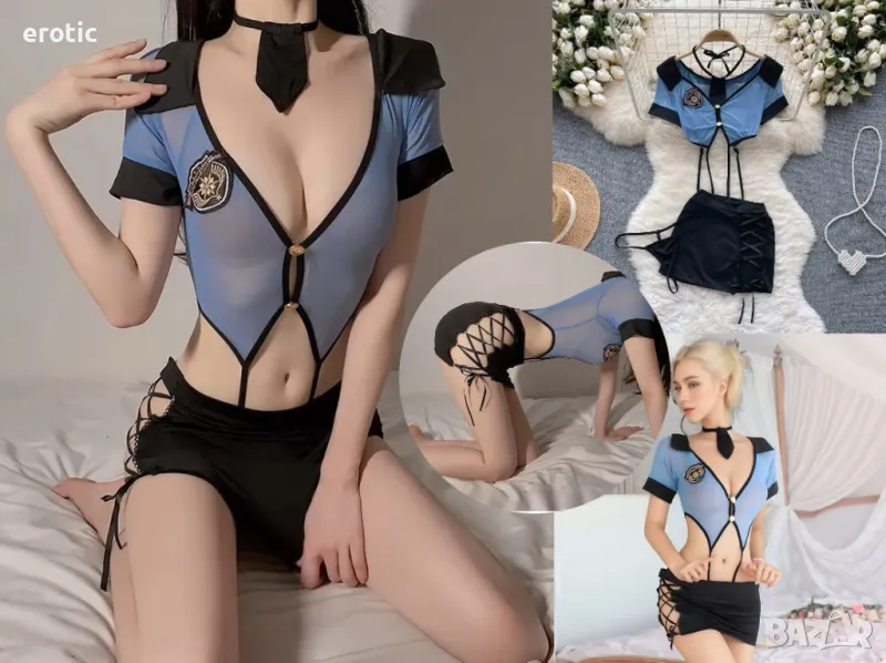 Секси костюм бельо дамска полицейска униформа. Екзотичен дамски комплект бельо полицейска униформа. Тази униформа на полицайка е идеална за тези, които търсят дързък и съблазнителен външен вид, което я прави подходяща за различни ситуации. Облекло за специална употреба, това облекло е идеално за лични моменти или събития, предлагайки уникално изживяване. Този секси униформен костюм на полицайка е идеален за онези, които се наслаждават на нотка фантазия в интимните си моменти. Секси униформен костюм на полицайка е предназначен да пленява и примамва, което го прави идеален избор за специални поводи.