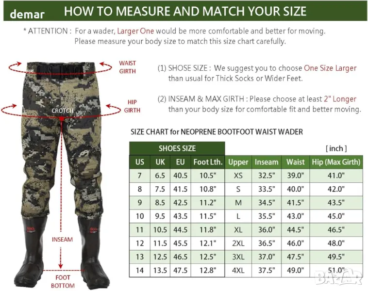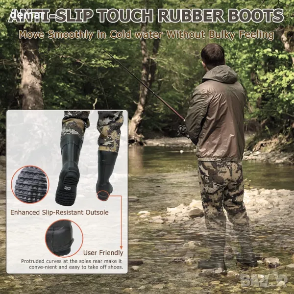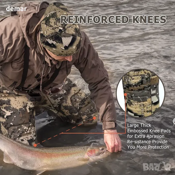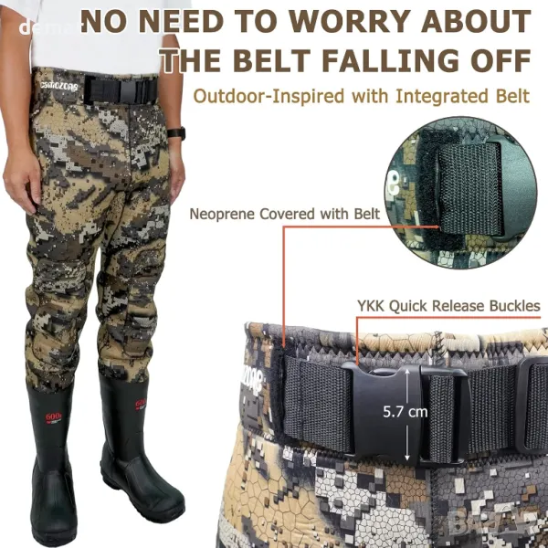 Изработени от водоустойчив неопрен, тези ботуши до кръста ви поддържат сухи и удобни по време на риболов или лов. Здравите гумени ботуши са подплатени с 3M Thinsulate за допълнителна топлина и издръжливост. Патентованият камуфлажен дизайн ви помага да се слеете с естествената среда, докато подсилените наколенки предлагат допълнителна защита в зони с високо износване. Регулируемият найлонов колан на талията с YKK катарама осигурява сигурно и персонализирано прилягане.