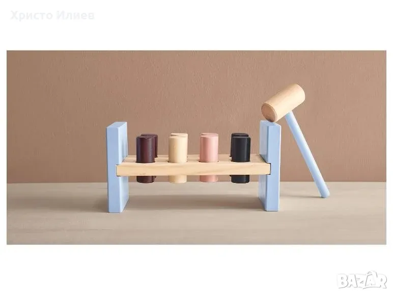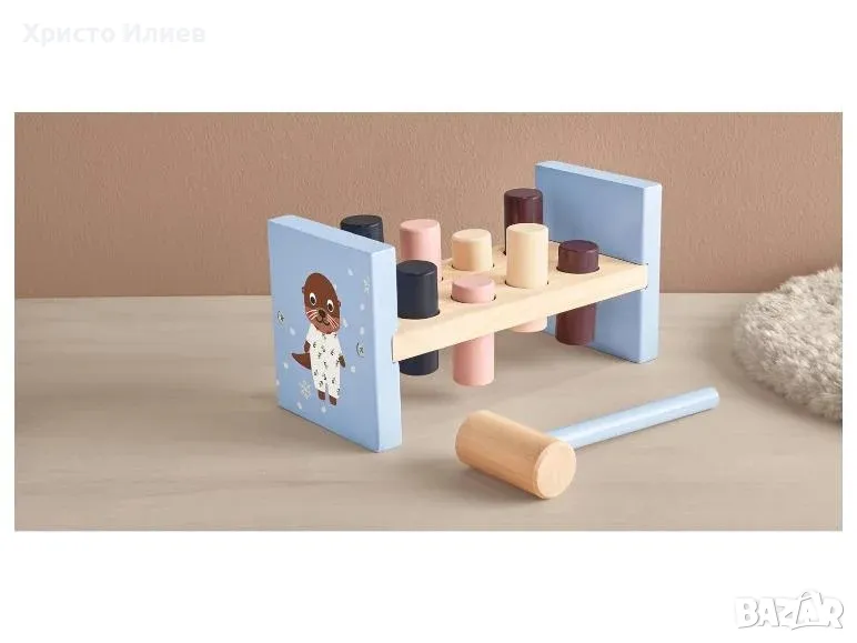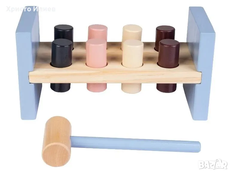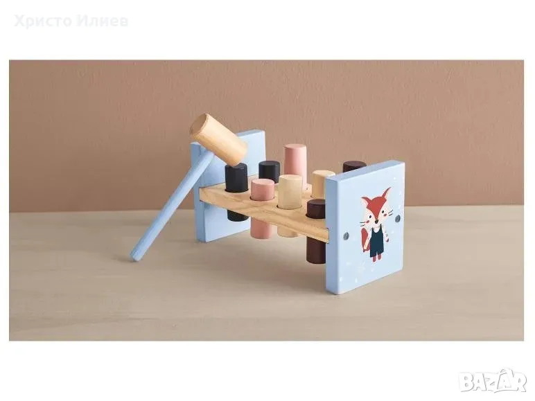 Тази забавна дървена играчка на Joueco развива координацията, сръчността и вниманието. Детето се учи да държи чукчето правилно и да преценява силата на удара. То осъзнава връзката причина-следствие - аз ударих "гвоздея"и той падна през дупката.