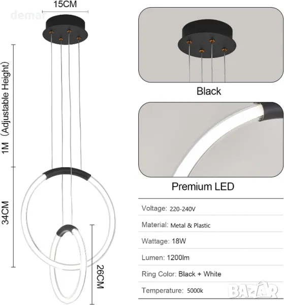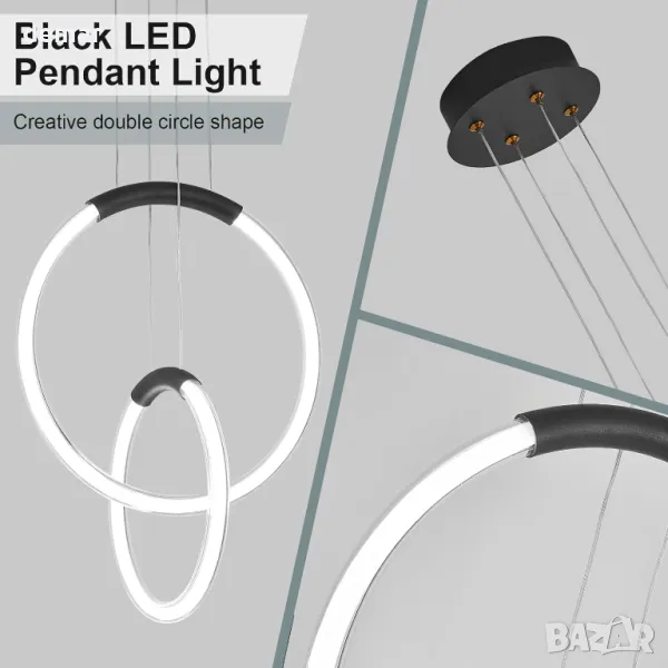 Този полилей се отличава с елегантен черен дизайн с вградени висококачествени LED чипове, предлагащи меко, бяло осветление на дневна светлина чрез акрилно покритие с висока пропускливост. Той е с регулируема височина, за да отговаря на различни нива на тавана и е изработен от издръжлив метал и пластмаса за дълготрайна работа и подобрена дифузия на светлината. Енергийно ефективен и без отблясъци, той е лесен за инсталиране с целия включен хардуер, което го прави стилен и практичен избор за модерен интериор.