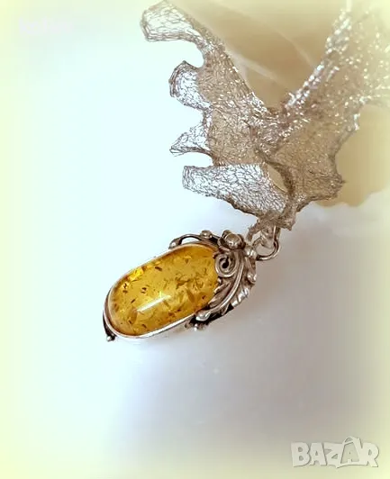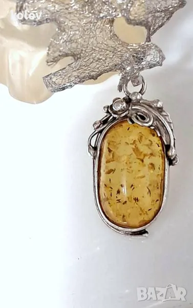 Елегантен медальон, изработен от сребро с изящни флорални орнаменти, обгръщащи естествен кехлибар. Ръчна изработка, което го прави единствен по рода си. Идеален подарък или стилно допълнение към всяка визия.