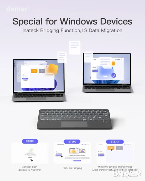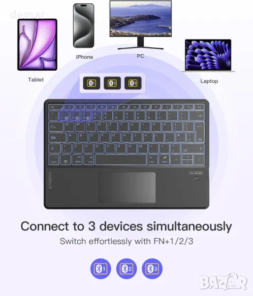 Клавиатура Inateck с тъчпад, AI функция, ултратънка Bluetooth за Windows/iPadOS/Android/iOS,KB01104