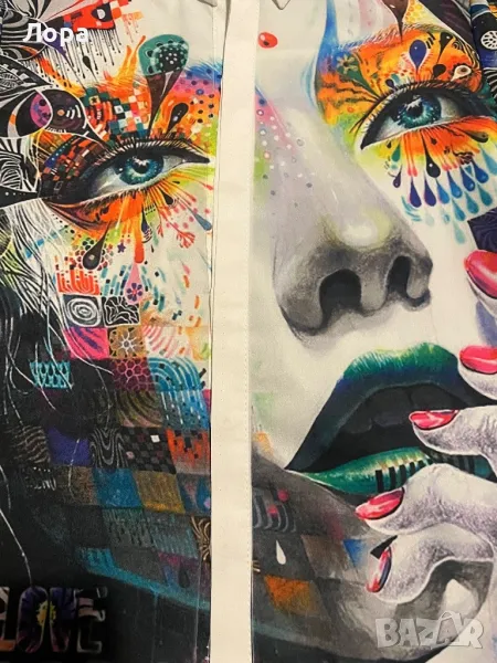 Ефектна дамска риза от немачкаема лека материя.Ширина от мишница до мишница 48 см.От рамо до рамо 38 см. Дължина на ръкава 60 см. Талия 43 см. Дължина на ризата 61 см в предната част и 71 см в задната част. Ръкавите стават на къси. Ризата няма забележки.