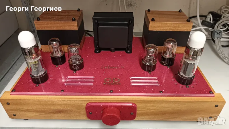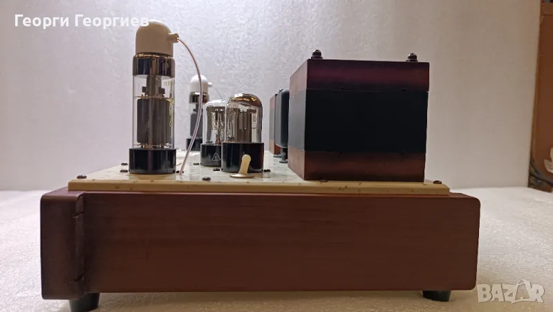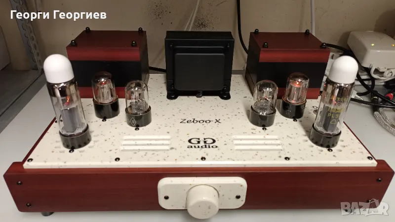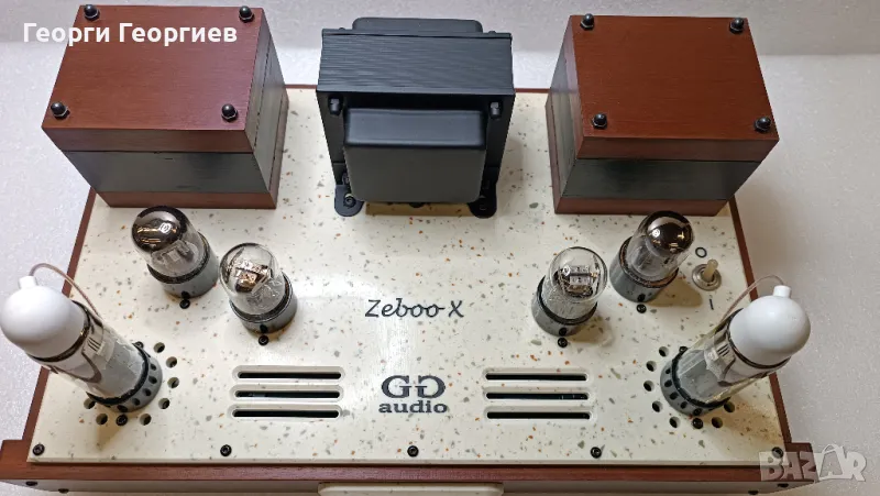 лампов усилвател, без обща обратна връзка. Входна лампа с автоматично преднапрежение с катодни кондензатори Rubycon Black Gate. Изходна лампа – PL36. Галванична (постояннотокова) връзка между двете стъпала, липса на кондензатори и резистори в катода на изходната лампа, липса на междустъпални прехвърлящи кондензатори. Независимо двуполярно (+,- и маса) захранване за всеки канал. Регулатор на усилването с потенциометър ALPS RK09. Значително по-големи (в сравнение с тези на Zeboo) изходни трансформатори - мое производство - на Ш-ламела Ismet (Германия) и подобаващо секциониране. Независими електронни дросели за всеки канал, изградени с елементи на Vishay. Използвани кондензатори по захранване – електролитни Nichicon (12 броя), индустриални полипропиленови KEMET DC-link (4 броя), полипропиленови CBB (8 броя). Двувходов превключвател.Качествени бакелитови (не китайски) NOS цокли за лампите с посребрени контактни пластини от пружинен бронз. Входни конектори Elecaudio, изходни Monacor BP-405G. Използвани резистори KIWAME. Автоматика за закъснително подаване и плавно нарастване на анодното напрежение с цел удължаване живота на лампите. Окабеляването по сигнал - сребърен проводник на Nimak, AWG24(0,5мм), чистота 5N. Окабеляването по захранване - с италиански OFC проводник. Спойките са осъществени с припой с високо съдържание на сребро. За любителите на цифри: Максимална изходна мощност – 8,5W/канал, честотна лента - 10Hz-25kHz. Звукът – свободен, дишащ, отворен - истинска емоция. Благодарение на специфичното схемно решение, използването на висококачествена елементна база по захранване, както и липсата на прехвърлящи кондензатори звукът е жив и натурален, с изключителна детайлизация и финес, с потресаваща микродинамика дори и при тихо слушане. Басът е стегнат, но много дълбок, обемен и релефен пак поради същата причина. А вокалите, ех вокалите... като в изпълнение наживо - с шокиращо присъствие. Звук, който те кара непрекъснато да настръхваш докато слушаш. Продава се БЕЗ захранващ кабел. При сериозен интерес може да бъде чут при мен на двулентова Open Baffle озвучителна система Yamaha NS-18.