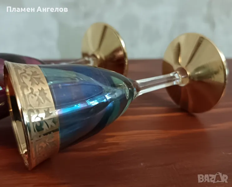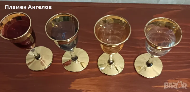 Италиански винтидж комплект от 4 красиви малки чашки за ликьор. Златен кант с орнаментика и позлатено столче. От 60те години на миналия век. Люстер стъкло, изглежда седефено, пречупва светлината в различни нюанси. Рядко срещани-колекционерски. Размери:високи. 9.7см.,диаметър 4.3см.,диаметър на столчето4.8см.Вместимост 20ml.