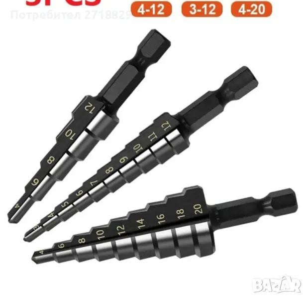 Стъпаловидни свредла(Боркорони) 3бр-размери 3-12мм/4-12мм/4-20мм, снимка 1 - Винтоверти - 49718675 Стъпаловидни свредла(Боркорони) 3бр-размери 3-12мм/4-12мм/4-20мм, снимка 2 - Винтоверти - 49718675 Стъпаловидни свредла(Боркорони) 3бр-размери 3-12мм/4-12мм/4-20мм, снимка 3 - Винтоверти - 49718675 1/3