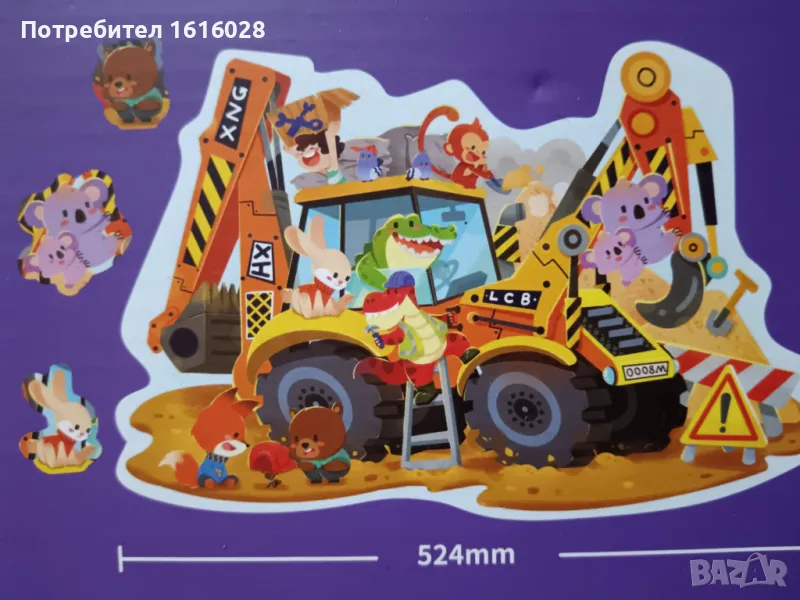 Детски пъзел с багер с животни.С големи твърди частиот хубав качествен картон,с цветни картинки лесни за подреждане и от малки дечица.Някои от частите са с картинки и форми на животни.
