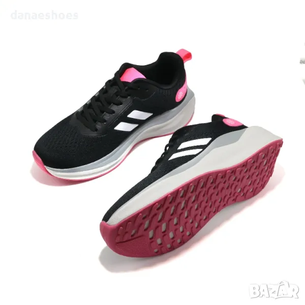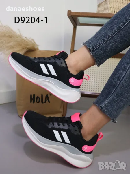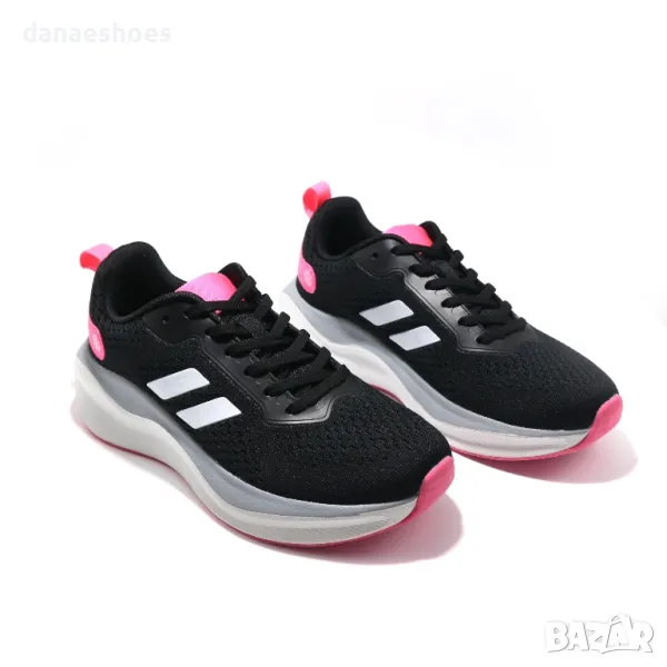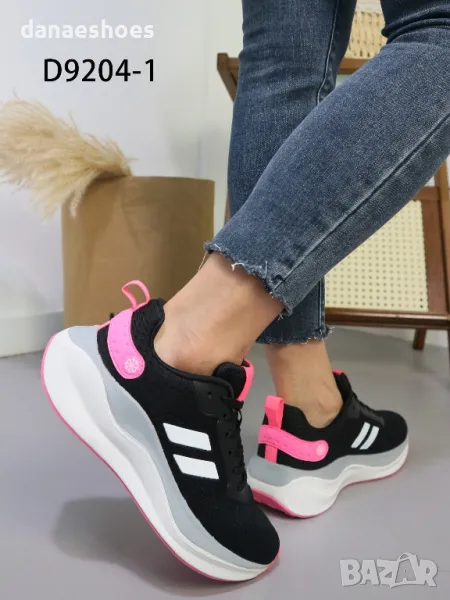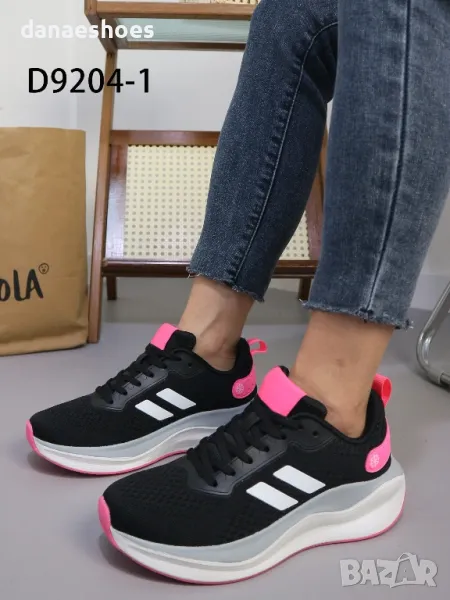 Дамски маратонки с анатомична подметка. Изработени от дишаща материя в черно, декорирани с бели ленти и леки акценти в циклама. Много леки и удобни.