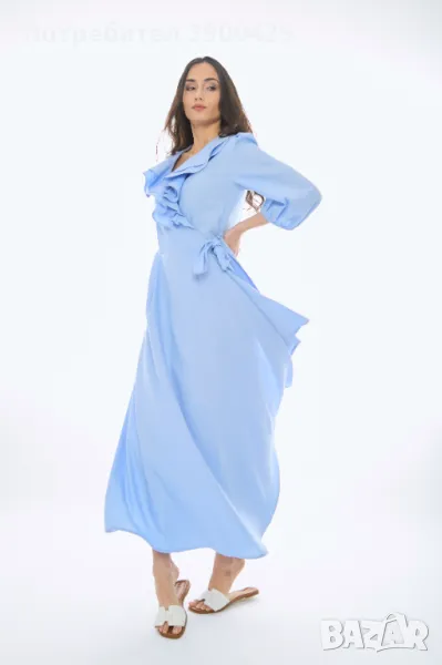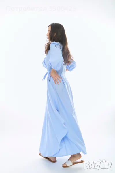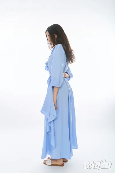 Дълга ленена рокля тип “Прегърни ме” с красиви къдри на деколтето и джобчета в страничните шевове.