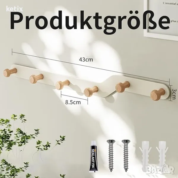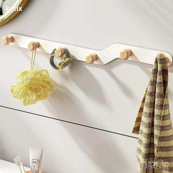 Неръждаема стоманена закачалка с 6 естествени дървени куки, стикери и винтове, стенна модерна закачалка за якета, шапки и чанти, бяла