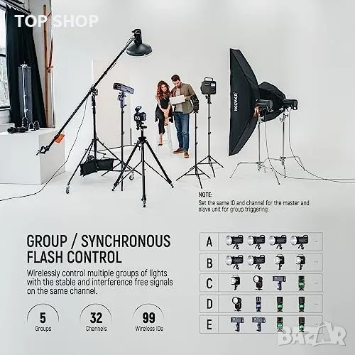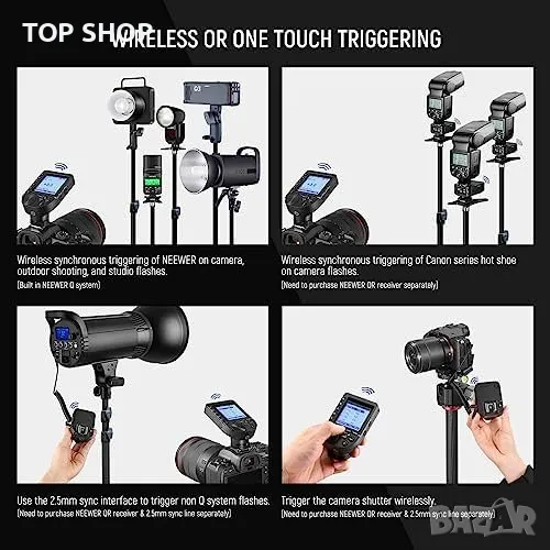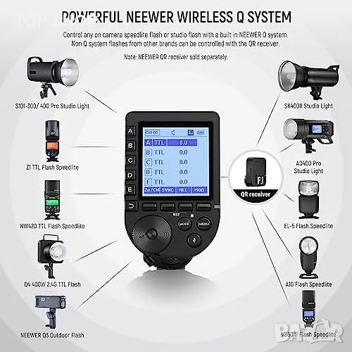 Вградена 2,4G безжична Q система за безжично задействане на съвместими светкавици NEEWER.