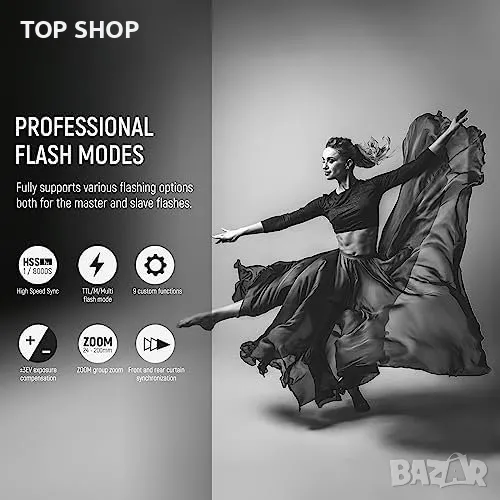 Поддържа TTL автоматична светкавица, компенсация на експозицията на светкавицата, високоскоростна синхронизация 1/8000s, стробоскопична светкавица, ръчна светкавица и др.