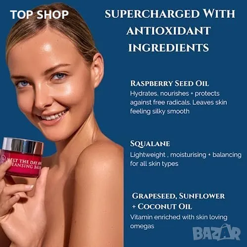 Обогатен с богати на антиоксиданти съставки като масло от малинови семена, което дълбоко хидратира и защитава кожата от свободните радикали. Съдържа също така масла от гроздови семки, слънчоглед и кокос, които осигуряват важни витамини и подхранващи омега съединения за гладка и сияйна кожа.
