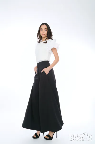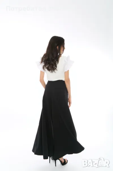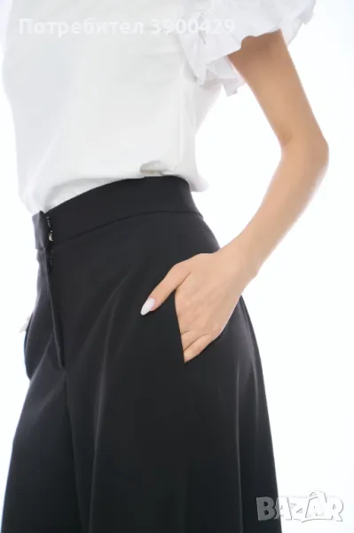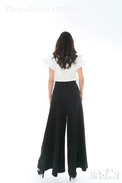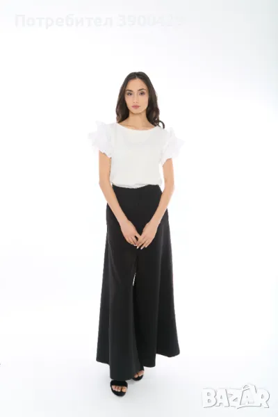 Елегантен панталон с много широки крачоли, които придават лек и ефирен вид на силуета.