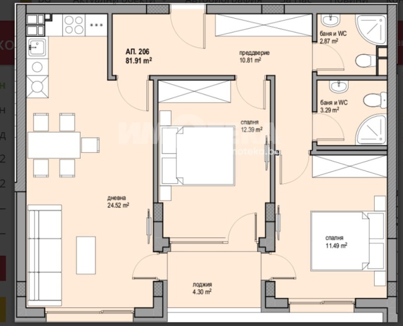 Тристаен апартамент със застроена площ от 81.91 кв.м. Състои се от: преддверие, трапезария 24.52кв.м., , две спални, две бани, склад, лоджия . Изложението е ЮГ/З Има възможност за закупуване на паркомясто или гараж.