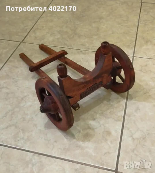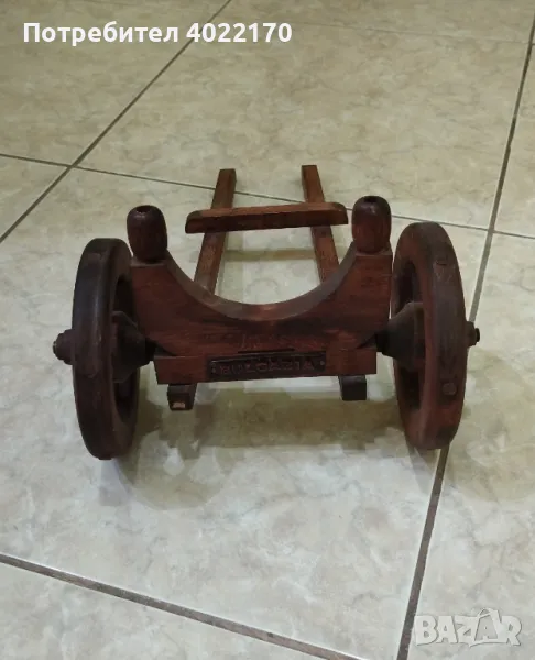 Поставка за бутилка вино или друг алкохол, ръчно изработена от махагоново дърво. Прилича на "Черешово топче", с надпис от кована мед "BULGARIA". Размери: 13 х 21 х 31 см, тегло 240 гр. Отлично състояние. Не се произвеждат такива вече за съжаление и цената му с годините ще се покачва.