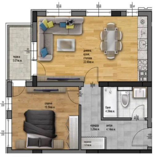 Жилището, което предлагаме за продажба е двустайно с южно изложение, състои се от дневна с кухненски бокс и трапезария-22,90 кв.м, спалня -13,39 кв.м, баня с тоалетна, антре, коридор, перално помещение и тераса. Обща площ 77,49 кв.м.