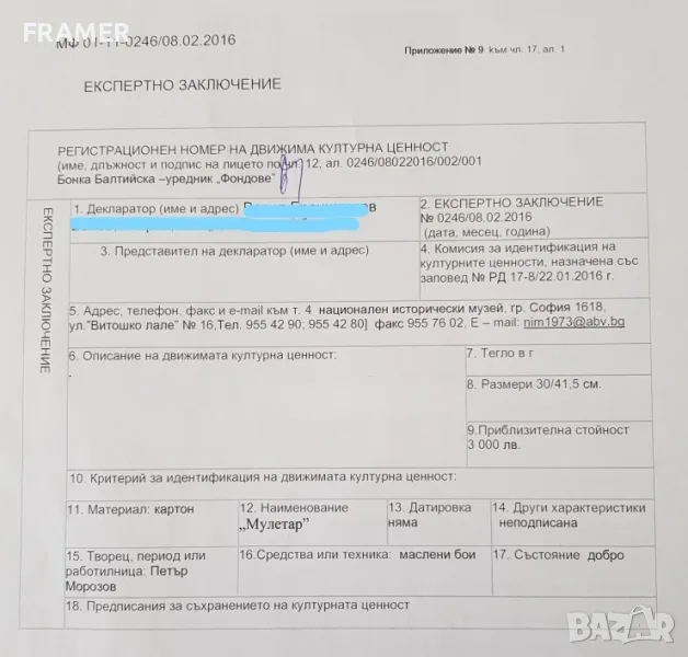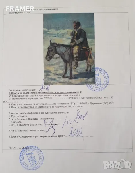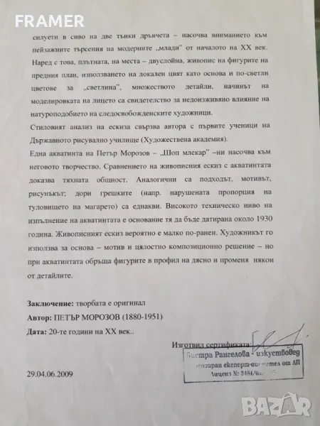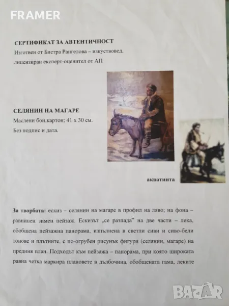 Картината има идентификация и 2 сертификата за автентичност от галерията и Бистра Рангелова