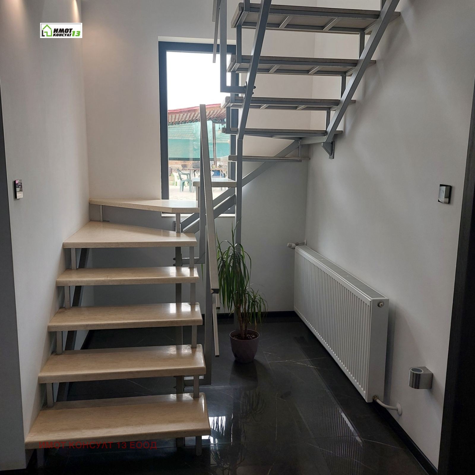 🏠 Просторен коридор с поръчково портманто, стълбище от метална конструкция и камък.