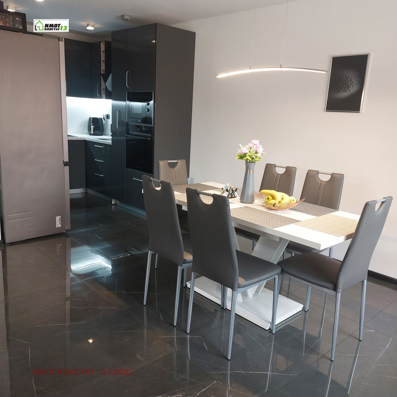 🏠 Огромна обзаведена всекидневна с напълно оборудвана поръчкова кухня, вградени електроуреди висок клас и стилна трапезария.
