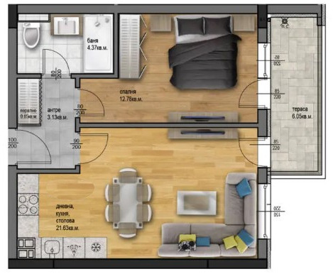 Жилището, което предлагаме за продажба е ДВУСТАЙНО С ИЗТОЧНО ИЗЛОЖЕНИЕ, състои се от дневна с кухненски бокс и трапезария-21,63 кв.м, спалня-12,78 кв.м, баня с тоалетна, входно антре, перално помещение и тераса. Обща площ 67,37 кв.м.