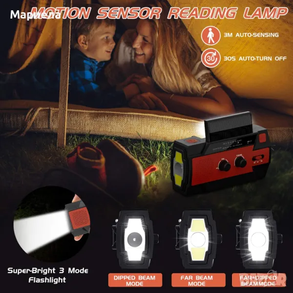 Това радио може да се използва не само за слушане на радио , но и като 5000 mAh захранваща банка, фенерче, светлина за четене и SOS аларма. То е идеален за туризъм, пикник, къмпинг, но също така и за вашия дом и градина, както и за работилница.