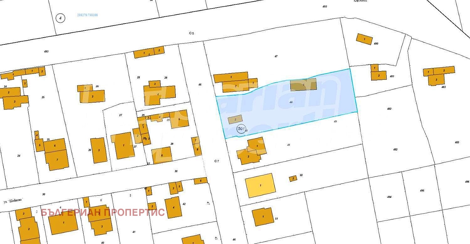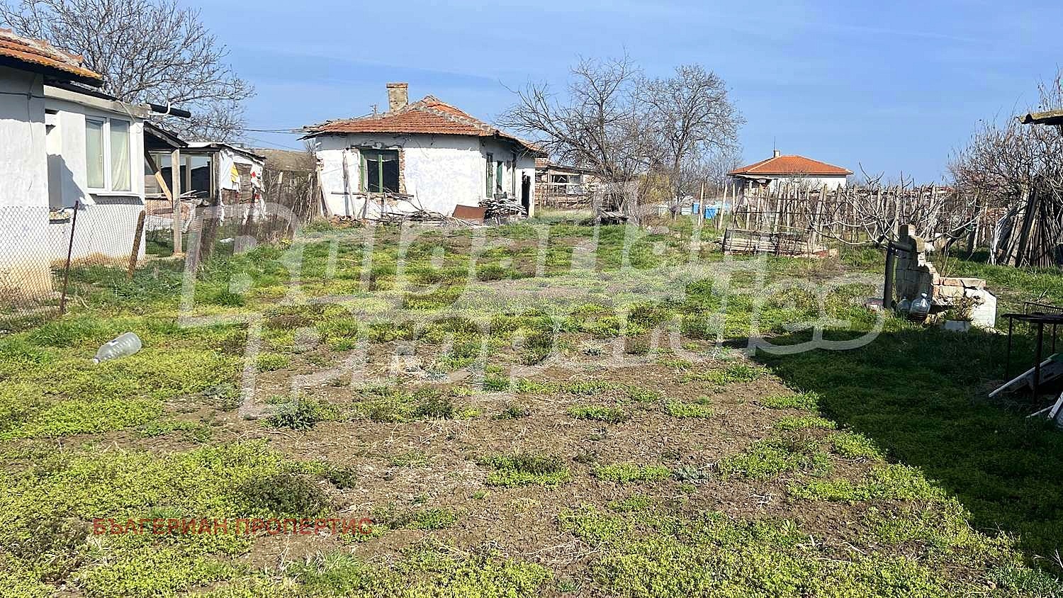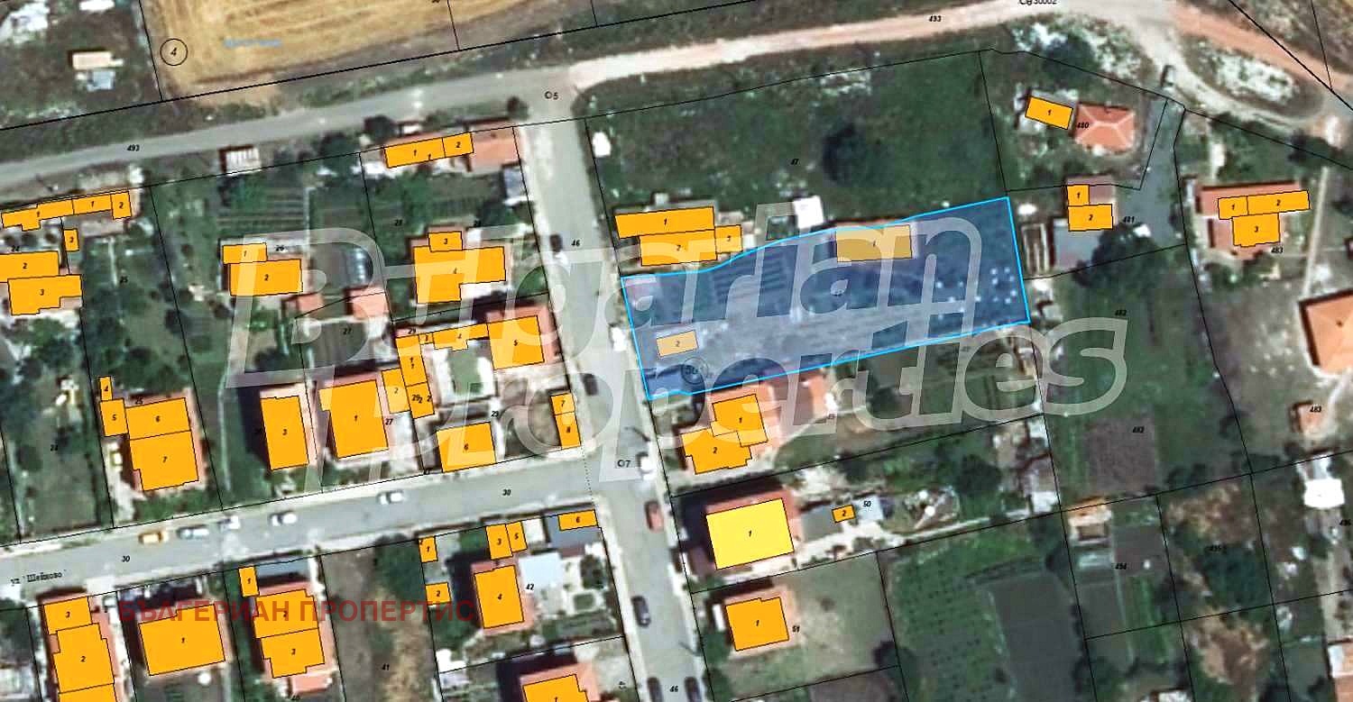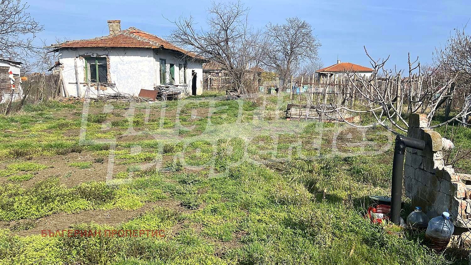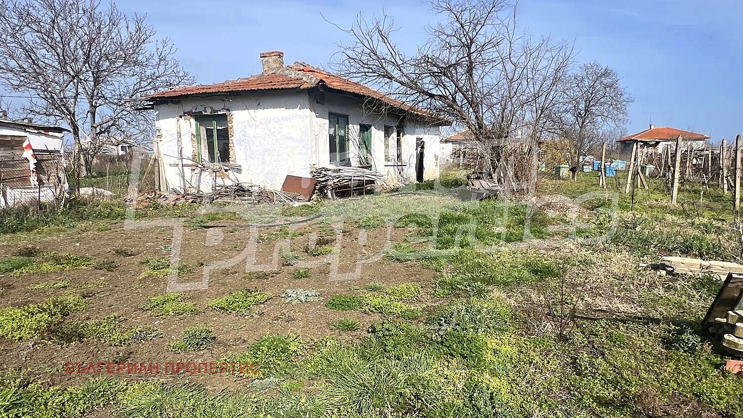 Парцелът е равен с правилна форма и ограден с метална мрежа. Включва стара къща за събаряне, лозе и навес/барака с ток и вода.