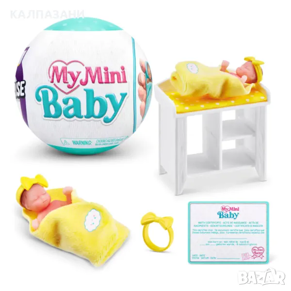 5 Surprise My Mini Baby са реалистични мини бебета с бебешки мека кожа и най-сладките мини личица. Обели, разопаковай и разкрий 5-те изненади вътре. Създай мини детска стая с комплектите за игра My Mini Baby - идеалното място за грижа за твоите мини бебета. Всяка капсула идва с подходящи тематични аксесоари, които да пасват на включеното бебе и комплект за игра. Има 12 различни бебета за събиране. Всяко със своите уникални аксесоари. Намери ги всички, за да изградиш своя собствена мини детска стая.