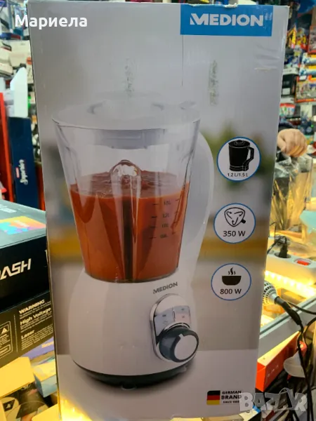 Пригответе до 1,2 литра вкусна супа с един уред! Нагревателният блендер MEDION MD16411 ви позволява да готвите храна и да смесвате всичко, без да се налага да прехвърляте съдържанието от тенджера в блендера. Мощността на нагряване от 800 вата позволява супата да се готви бързо, а моторът от 350 W ще анимира остриетата от неръждаема стомана, за да смила всичко грубо или идеално гладко според вашия избор. Крачета с вендузи за перфектна опора на работния плот. Блендерът може също да помогне при приготвянето на свежи напитки като смутита, той е идеалното допълнение към вашето кухненско оборудване.Приготвяне на супа до 1,2лПриготвяне на студени напитки до 1,5л