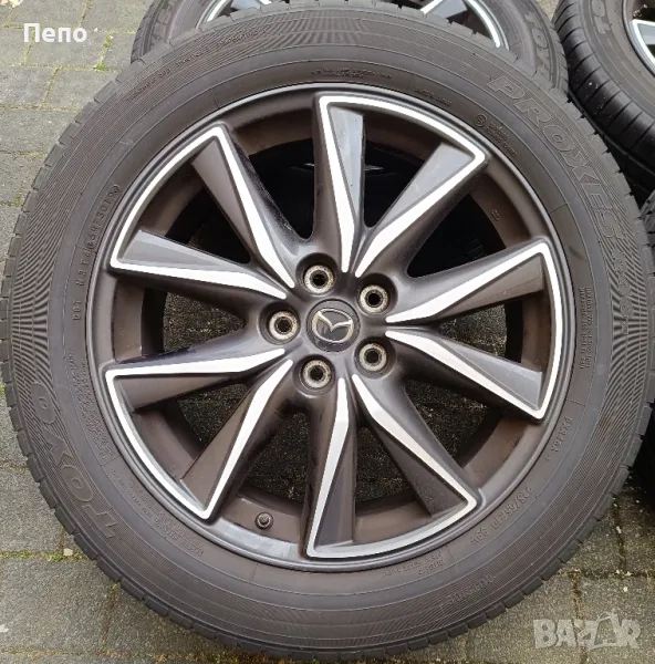 Оригинални джанти с летни гуми 19 цола за Mazda CX5.Джантите са внос от Германия в перфектно състояние без кривини и заварки.Гумите са летни Toyo 225/55/19 с протектор на грайфера 6-7мм дот 2019-2020г.Джантите са 7jx19et50 имат датчици за налягане.Повече информация по телефона.