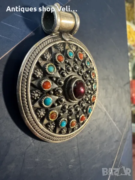 Масивен ръчно изработен сребърен медальон със полускъпоценни камъни. Добро състояние. Предлагаме доставка с Еконт и лично предаване за градовете Велико Търново, Русе и Сливен. Диаметър-4,5см.