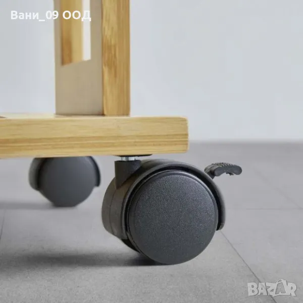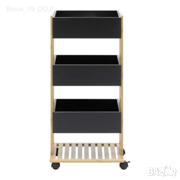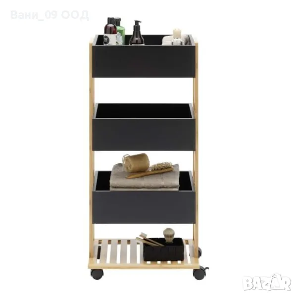 Подвижната етажерка съчетава стил и удобство. С елегантен черен цвят и дърво, дизайнът ѝ се вписва във всеки дом. Оборудвана е с три рафта с максимална товароносимост 5 кг. на рафт. А четирите колела със стопери позволяват удобното ѝ транспортиране. Подходяща е за съхранение на продукти за грижа, аксесоари за коса, кърпи и други.