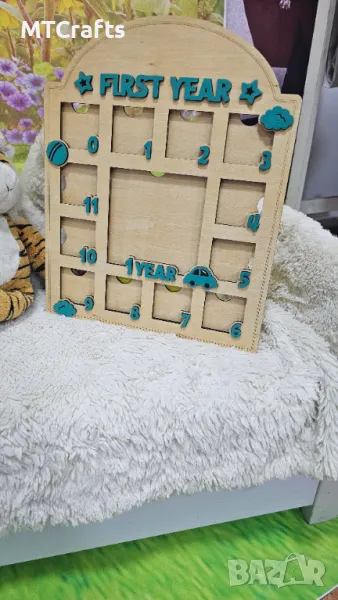 Запечатайте най-ценните моменти от първата година на вашето дете с този уникален дървен календар! Той разполага с 12 отделения – по едно за всеки месец, където можете да съхранявате малки снимки, бележки.