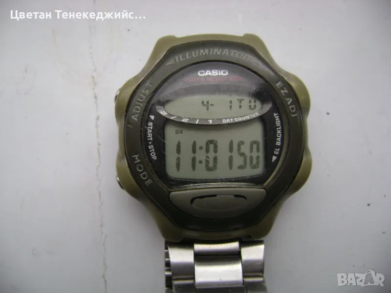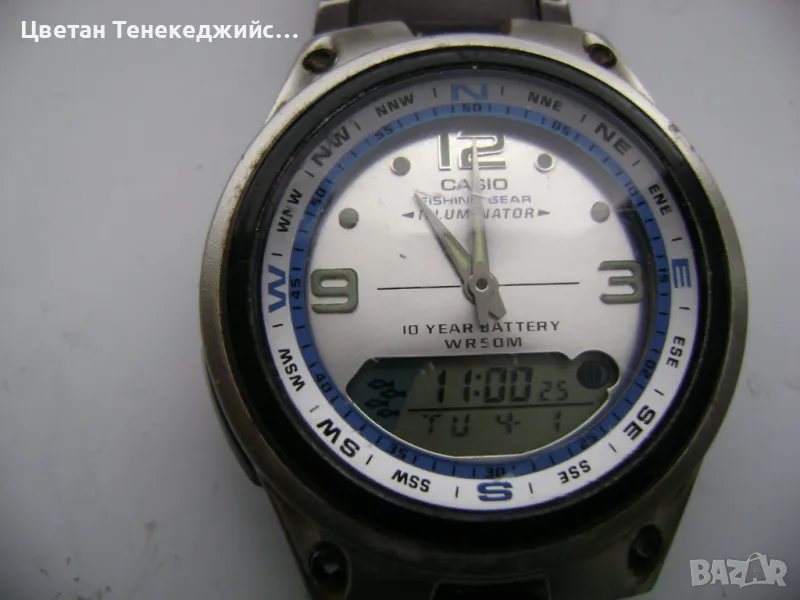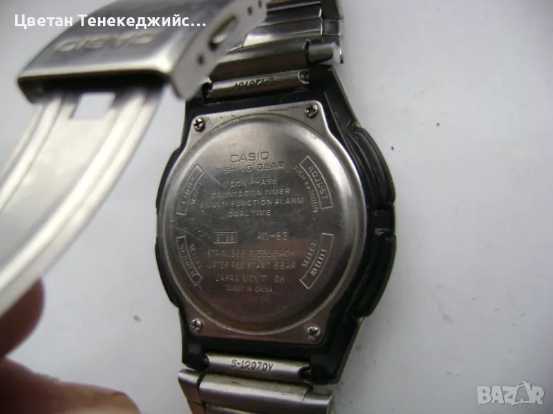 Casio AW-82 Fishing gear.Кварцов и аналогов.Работи точно.Лунни фази,таймер обратно броене,3 аларми,второ време,подсветка.Диаметър на касата-40мм.Водоустойчив 50м.Оригинална метална верижка с двойно закопчаване.-45лв.Продаден.