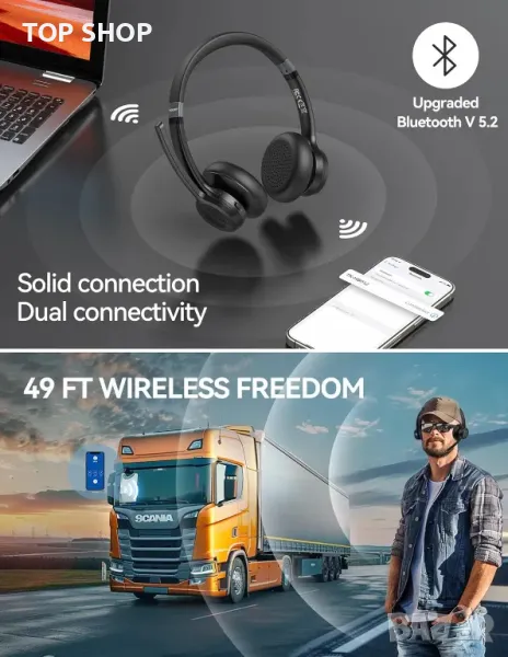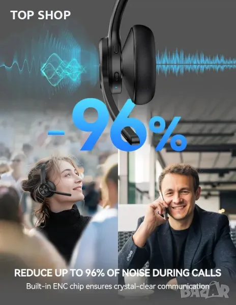 Тази Bluetooth слушалка разполага с усъвършенствано потискане на шума, блокирайки 96% от околния шум за ясна комуникация в шумна среда. Предлага висококачествен звук за филми, музика и чатове, заедно със защитаваща поверителността функция за заглушаване на микрофона. Най-новата технология Bluetooth 5.2 позволява свързване на две устройства в обхват от 20 метра и осигурява до 50 часа възпроизвеждане. Проектиран за комфорт през целия ден, той има въртящ се микрофон, регулируема лента за глава и меки подложки за уши. Той е широко съвместим с различни устройства и операционни системи с активиран Bluetooth, с лесни контроли за сила на звука, песни и заглушаване.