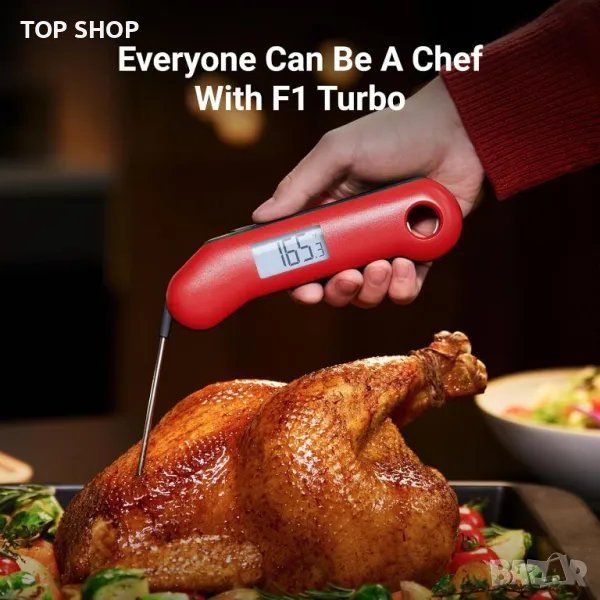 ThermoMaven F1 Turbo, сертифициран от NIST термометър, осигурява бързи и точни показания в рамките на ±0,5°F (±0,3°C) за по-малко от секунда, осигурявайки прецизно готвене. Той предлага двойни опции за съхранение с кука и магнит за удобство и е водоустойчив с рейтинг IP67, тестван в над 10 000 лабораторни изпитания за здравина. Допълнителните удобни за потребителя функции включват функция повдигане за събуждане, по-ярка подсветка за условия на слаба светлина и дисплей с автоматично завъртане, който се адаптира към потребители с дясна или лява ръка.