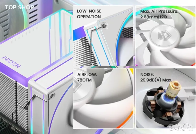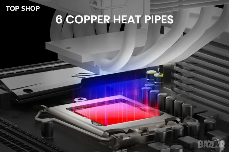 Този охладител на процесора включва шест медни топлинни тръби Ф6 мм и 120 мм FDB вентилатор, които ефективно разсейват топлината, осигурявайки оптимална производителност на процесора с максимален въздушен поток от 78 CFM и ниво на шум от 29,9 dB(A). Той поддържа PWM за автоматичен контрол на скоростта, предлагайки тиха работа и ултра тихо охлаждане. ARGB осветлението на охладителя подобрява вашия компютър с живи ефекти, а дизайнът му е съвместим с RAM, което го прави отличен избор за компютри с бял или светъл интериор.