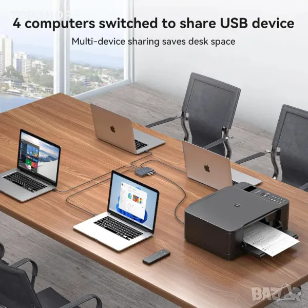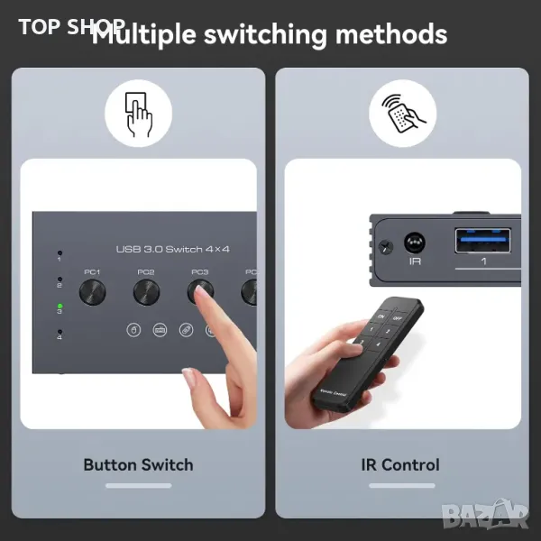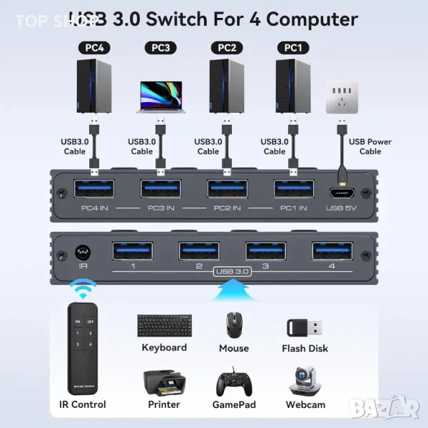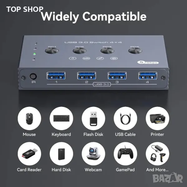 USB 3.0 превключвателят позволява безпроблемно споделяне на до четири USB 3.0 устройства, като клавиатури, мишки и принтери, между четири компютъра с превключване с едно щракване, избягвайки износването на портове и спестявайки място. Той поддържа ултра бързи скорости на трансфер на данни от 5 Gbps, обратна съвместимост с по-стари USB версии и функция plug-and-play. Потребителите могат да превключват между компютри с помощта на бутони на панела или включено дистанционно управление с LED индикатори за активни източници. Устройството включва 5V micro USB захранващ кабел за стабилна работа при свързване на периферни устройства с висока мощност. Съдържанието на пакета включва превключвател, дистанционно управление (батериите не са включени), USB кабели, захранващ кабел и ръководство.